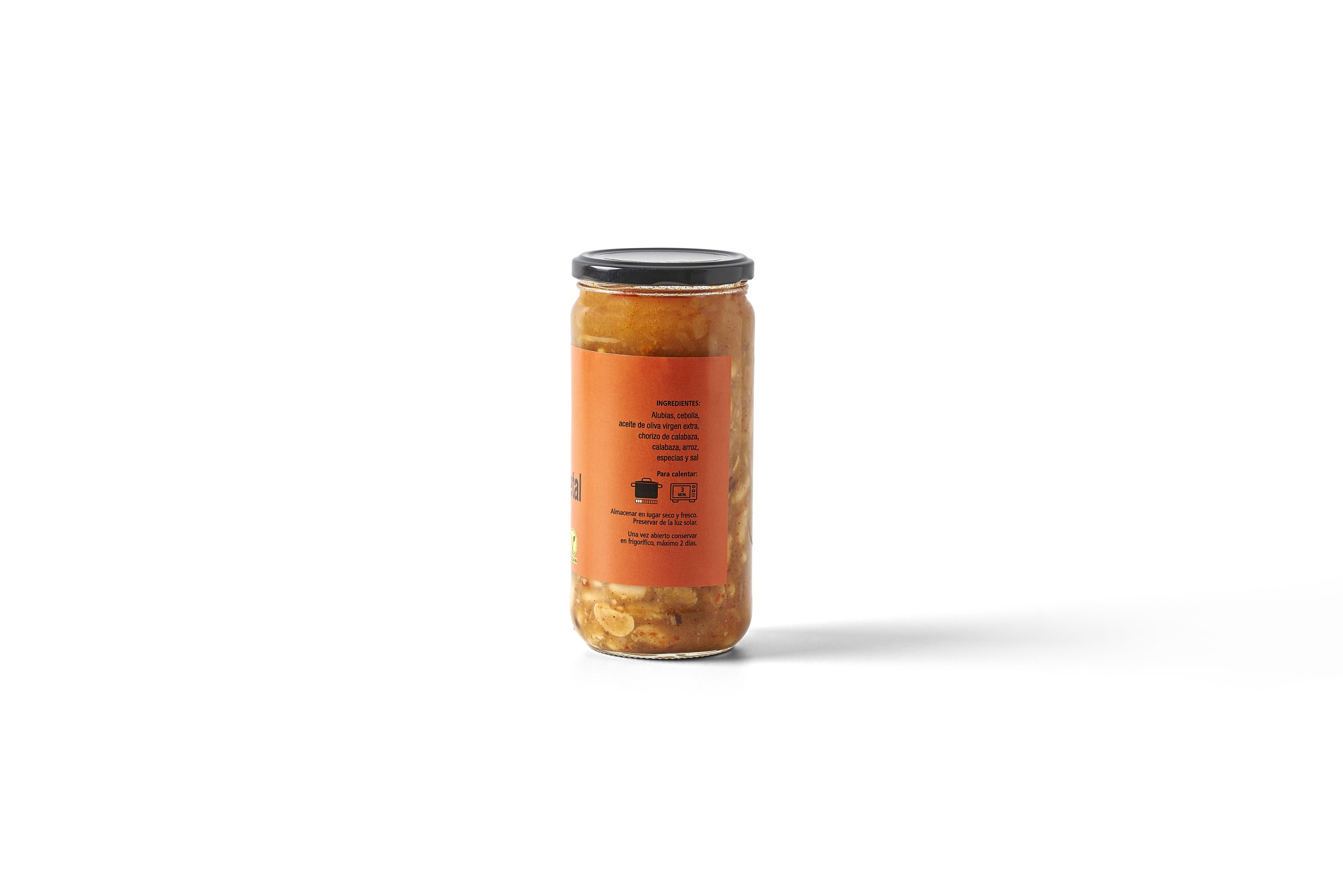 Alubias, cebolla, aceite de oliva virgen extra, calabizo (embutido de calabaza, 100% vegetal), morcilla vegana, calabaza, arroz, especias y sal.